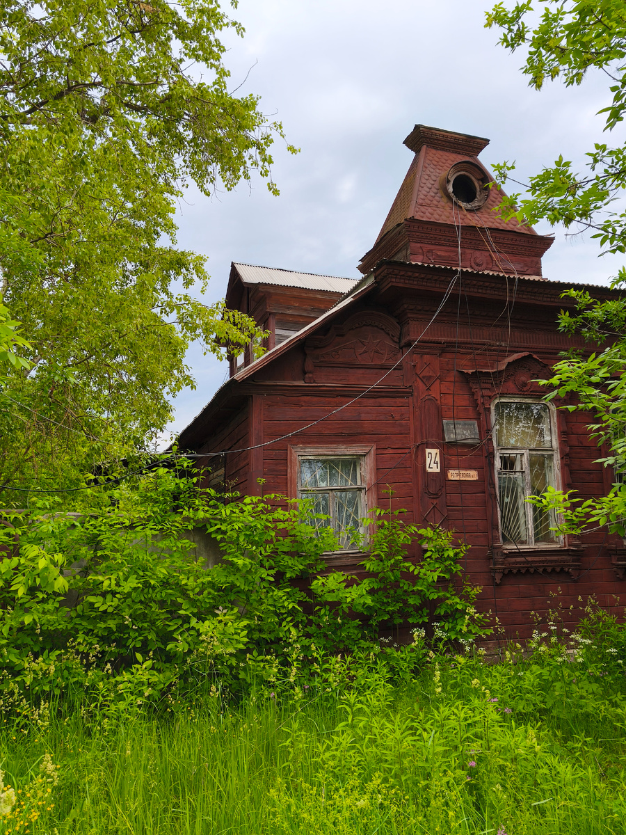 Дом Рыбакова, начала XX в., одноэтажный с мезонином на поперечной оси, поставлен к улице торцом. Рубленое, обшитое тесом здание на кирпичном цоколе обладает характерными чертами стиля модерн. Кровля усложнена угловыми островерхими башенками, окна с мягким очертанием фрамуги обрамлены нарядными разными наличниками; разделка оштукатуренного цоколя и тесовой обшивки мелким квадровым рустом имитирует каменную облицовку фасадов. Сложные измельченные наружные порезки носят интерьерный характер и близки мебельной резьбе XIX века.