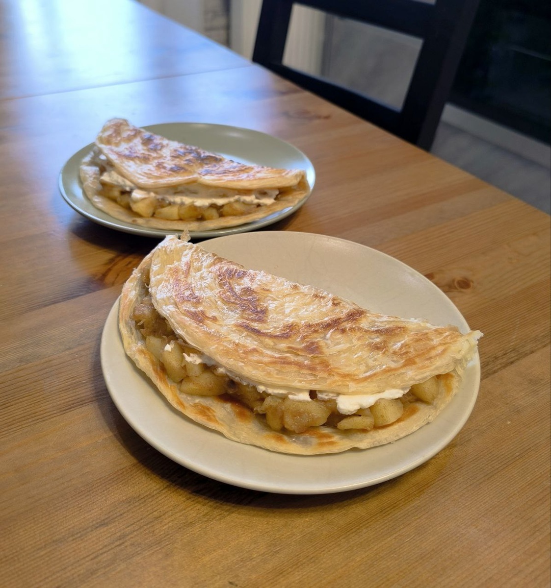Ленивый штрудель Ингредиенты: Лепёшка роти - 90г Яблоко - 90г Банан - 60г Рикотта - 40г 1) Обжарить лепёшку с двух сторон на сухой сковороде до золотистой корочки и сложить пополам. 2) Яблоко и банан очистить от кожуры и нарезать на небольшие кусочки. 3) Потушить фрукты на сковороде с небольшим количеством воды (100-150 мл) до мягкости, добавить корицу и сахзам по вкусу. 4) Выложить фрукты на лепёшку, сверху намазать рикотту, сложить лепёшку надвое. Для меньшей жирности можно попробовать сделать с лавашом. Кбжу на всю порцию: 434 ккал/9г белков/18г жиров/59г углеводов #десерт