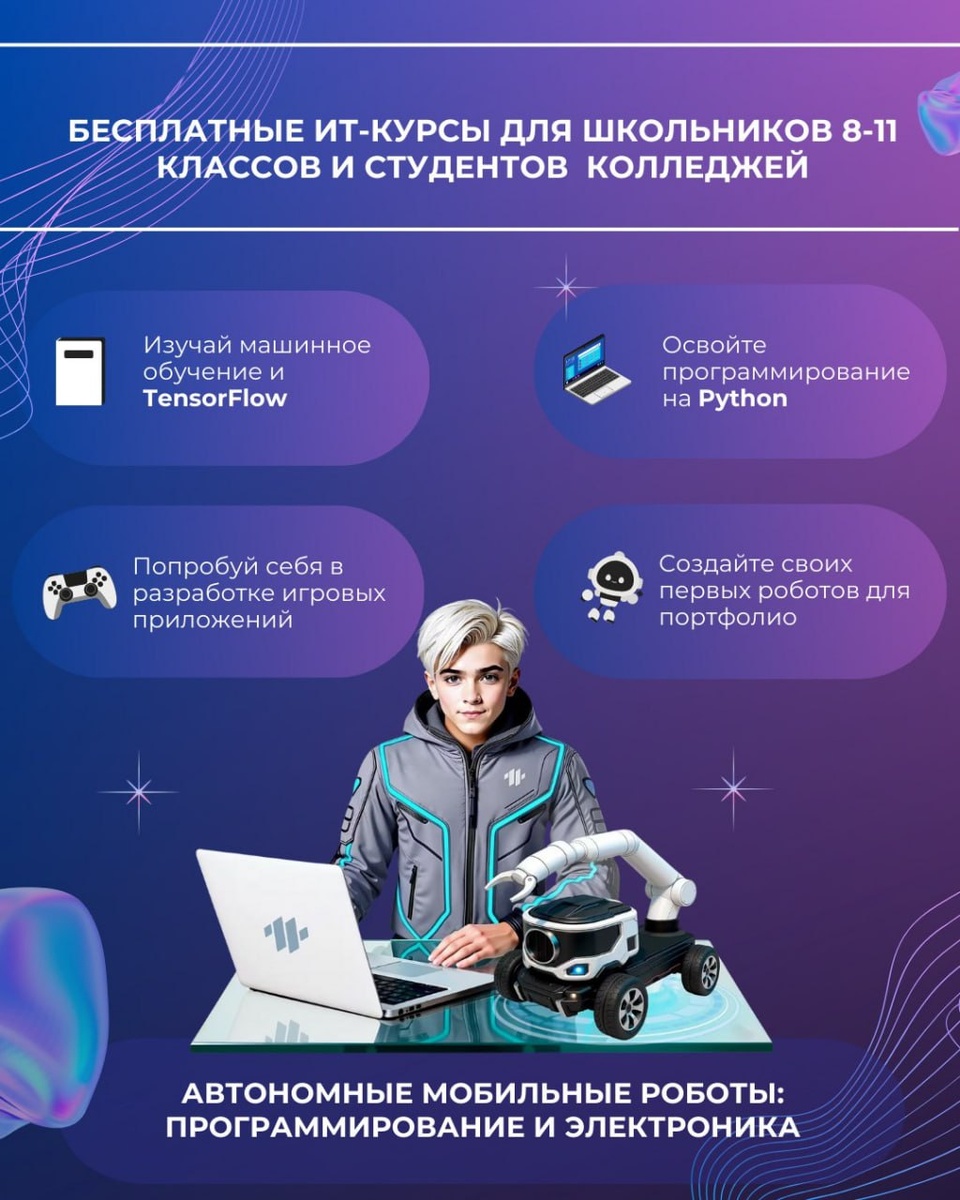 Стартует допнабор на бесплатные курсы программирования для школьников 8–11 классов Обучение начнётся в октябре На курсах ребята смогут: – попробовать себя в разработке игровых приложений – познакомиться с машинным обучением и библиотекой TensorFlow, понять, как «думают» нейросети – поэкспериментировать с программированием автономных устройств и беспилотников. 📍Центр опережающей профессиональной подготовки Забайкальского края, ул. 9 января, 43 🔑+79143570025 🔑+79141299250 #Новости Предложить публикацию:@zabkulisye_bot