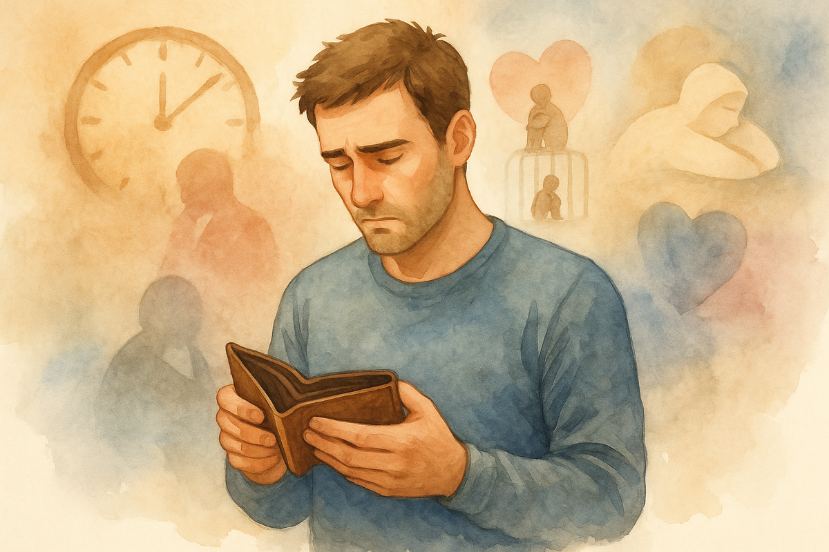 В итоге он словно живёт не в настоящем, а в вечном минусе — даже если счета давно закрыты.