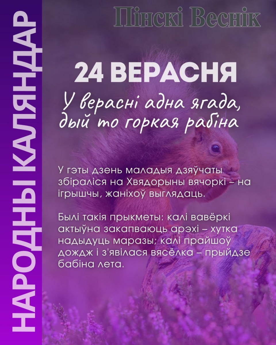 📎📎📎📎📎🔺📎📎📎 📎📎📎📎📎📎🔺📎📎📎 ✅24 верасня У гэты дзень маладыя дзяўчаты збіраліся на Хвядорыны вячоркі – на ігрышчы, жаніхоў выглядаць. Былі такія прыкметы: калі вавёркі актыўна закапваюць арэхі – хутка надыдуць маразы; калі прайшоў дождж і з'явілася вясёлка – прыйдзе бабіна лета. #народныкаляндар 📍📍@Пинский Вестник ЮТУБ | САЙТ| ИНСТ | ВК | ОК | ФЕ | Прислать новость