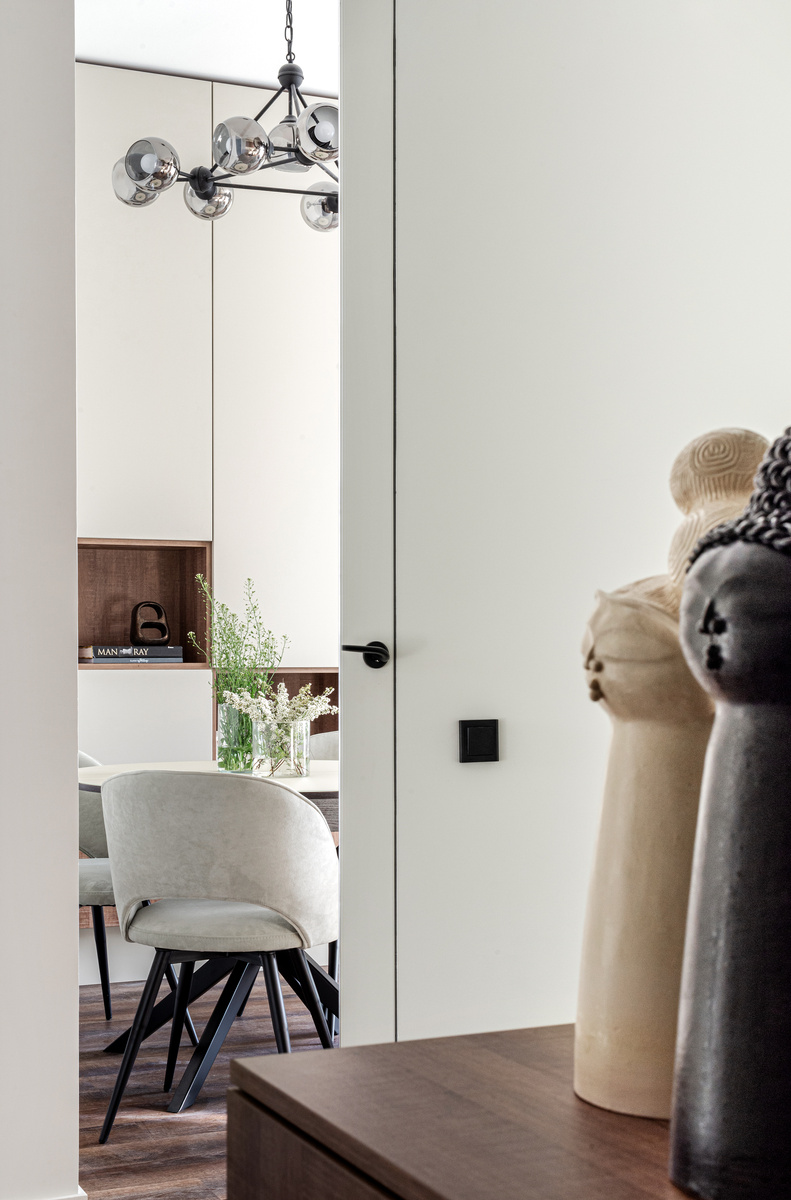 Сначала это казалось дерзкой идеей, но именно она дала свободу пространству: Санузел здесь задумывался как логичное продолжение спальни, а не как отдельное замкнутое пространство. Этому помогает общее оформление: Благодаря такому подходу ванная не «спорит» с интерьером спальни, а становится её органичной частью. Здесь царит ощущение лёгкости и гармонии, а пространство воспринимается цельным и современным. В гостиной и кухне мы сделали ставку на свободу и свет. Отказались от перегородок, а зонирование выстроили за счёт расположения мебели.