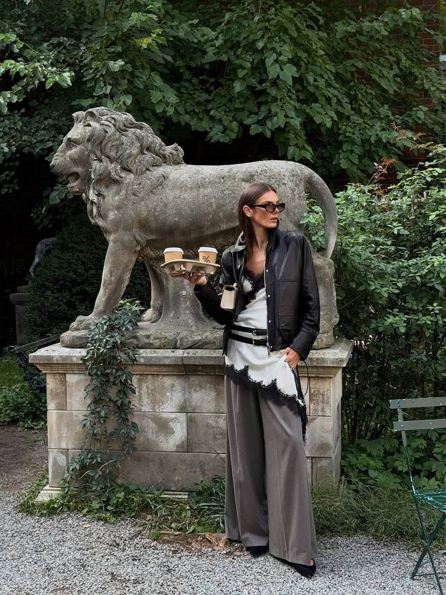 Шедевральный образ от Tezza Barton. Платье-комбинация с кружевом в дуэте с кожаной курткой и серые брюки. Но главные герои - два ремня. Именно они виртуозно собрали все элементы воедино, добавив деталей, и вывели образ на абсолютно новый уровень. Мне прямо очень нравится, не могла не поделиться, ну и мораль сей басни такова😉 #идеяобраза Попробуйте два ремня, если еще не