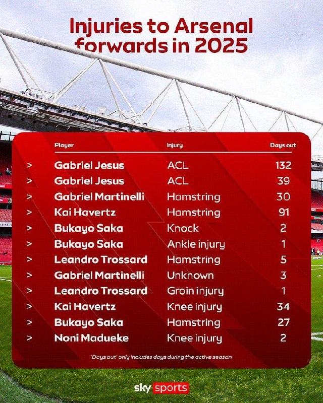 Травмы атакующих игроков "Арсенала" в 2025 году и количество пропущенных ими дней 🚑