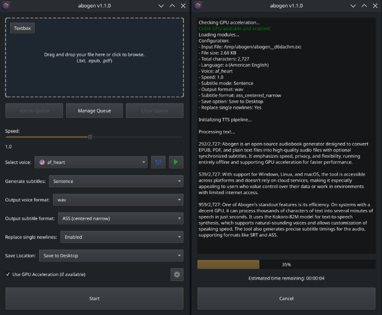 π abogen β ΡΡΠΎ ΠΈΠ½ΡΡΡΡΠΌΠ΅Π½Ρ, ΠΏΠΎΠ·Π²ΠΎΠ»ΡΡΡΠΈΠΉ Π³Π΅Π½Π΅ΡΠΈΡΠΎΠ²Π°ΡΡ Π°ΡΠ΄ΠΈΠΎΠΊΠ½ΠΈΠ³ΠΈ ΠΈΠ· ΡΠ°ΠΉΠ»ΠΎΠ² ΡΠΎΡΠΌΠ°ΡΠΎΠ² EPUB, PDF, ΡΠ΅ΠΊΡΡΠΎΠ²ΡΡ