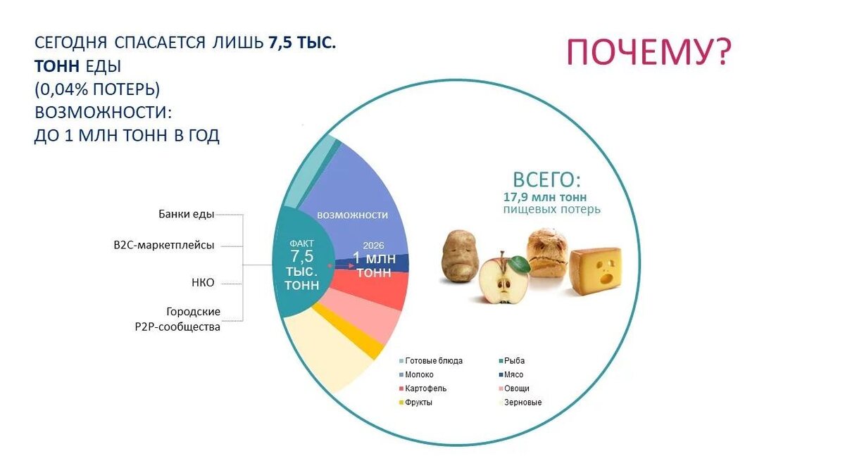 потенциальный годовой объем спасенного продовольствия может достичь 1 млн тонн, а это – возможность обеспечить едой около 1,3 млн нуждающихся россиян, предотвратить выброс 143 тыс. тонн метана, а также сделать бизнес на