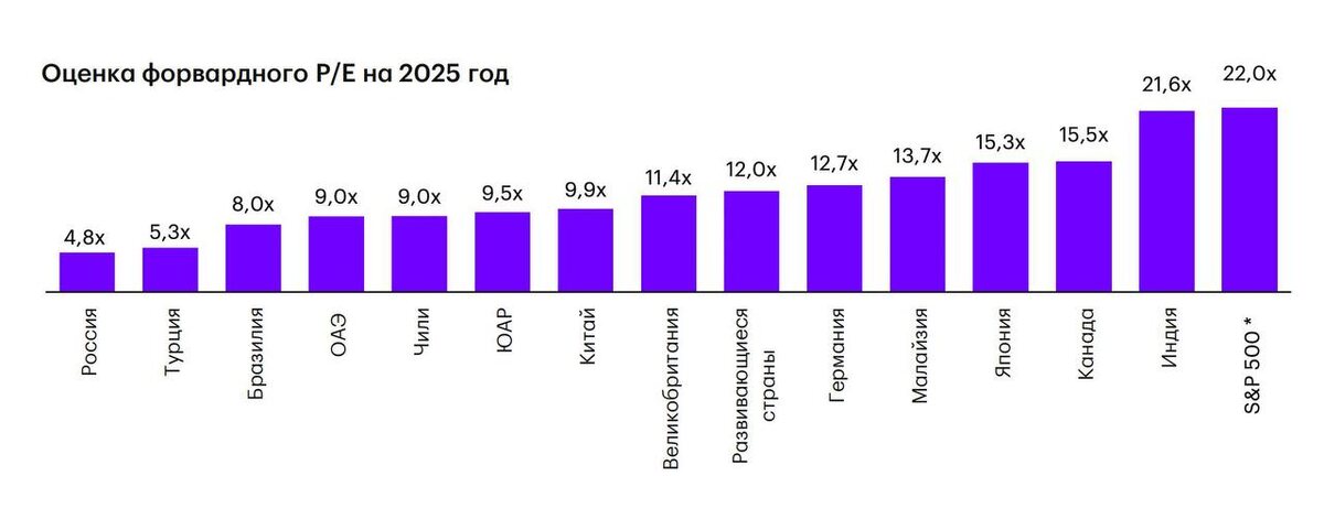 А упадёт ли индекс Мосбиржи до 2600 пунктов? Когда покупать акции? Или стоит подождать, пока они подешевеют? Ниже мы ответим на эти вопросы, начав с причины недавнего падения российского рынка акций. 💡Можно ссылаться, конечно, на геополитический фон, но ОСНОВНАЯ ПРИЧИНА – это снижение ключевой ставки на 1% (ниже консенсуса) и жесткая риторика ЦБ. Регулятор рассматривал вариант сохранения ставки, а это значит, что в случае ухудшения ситуации он может поставить снижение на паузу. Фундаментальная картина👇 ✅По данным GuruFocus (см. картинку 1) российский рынок акций потенциально может быть одним из самых доходных в мире благодаря низким оценкам. Показатель: капитализация рынка / (ВВП + активы ЦБ) находится около 19,5, что указывает на значительную недооценку (минимум был на уровне 6,6, максимум – 87,3). ✅По данным "Атон" (см. картинку 2) российский рынок самый дешёвый по показателю fwd P/E, который на 45% ниже средних исторических значений. Техническая картина👇 После заседания ЦБ РФ по