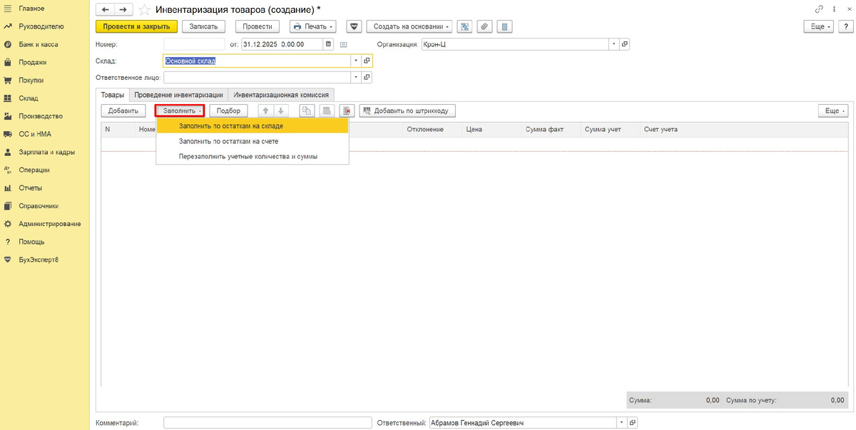 Проведение инвентаризации товарно-материальных ценностей (ТМЦ) в программном продукте 1С:Бухгалтерия предприятия 8 отражается документом Инвентаризация товаров. Путь меню Склад – Инвентаризация – Инвентаризация товаров. Операции – Инвентаризация товаров. Документ используется для отражения не только товаров, но и запасов: Документ Инвентаризация можно сформировать по каждому материально-ответственному лицу отдельно, заполнив поле Ответственное лицо из справочника Физические лица. В этом случае Склад оставить незаполненным. Если требуется провести инвентаризацию ТМЦ по складу, то в поле Склад выбирается значение из справочника Склады. При этом Ответственное лицо будет заполнено автоматически, если в карточке склада указано Ответственное лицо. Вкладка Товары заполняется автоматически по кнопке Заполнить остатками на складе на дату проведения инвентаризации. В случае обнаружения неучтенных ТМЦ можно внести позиции кнопкой Добавить. На вкладке Проведение инвентаризации необходимо заполнит