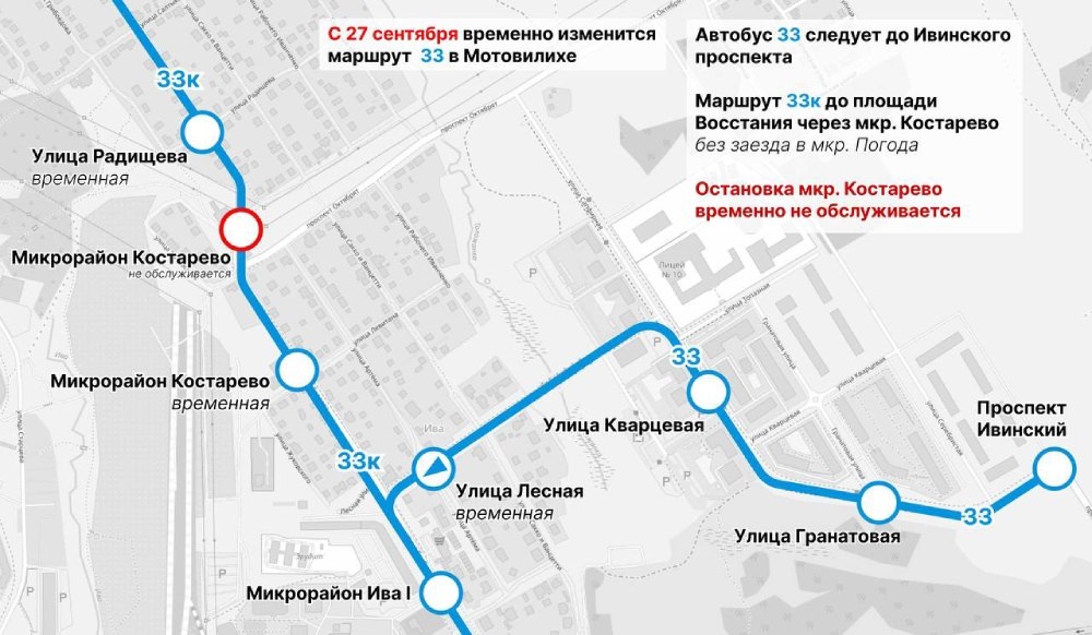 В Перми с 27 сентября из-за строительных работ временно перенаправят три автобусных маршрута. Автобус №33 будет ездить из центра Перми до Ивинского проспекта. Кроме того, здесь появятся новые рейсы №33К. Они будут курсировать через микрорайон Костарево до площади Восстания. Будет исключена существующая остановка «Микрорайон Костарево». Для жителей района появятся три новые временные остановки: «Улица Радищева», «Улица Лесная» в сторону центра и «Микрорайон Костарево» в створе ул. Левитана. В Орджоникидзевском районе Перми изменятся маршруты двух автобусов №48 и 73. От микрорайона Январский в сторону ул. Первомайской автобусы будут курсировать по улицам Январской и Верхоянской вместо ул. Лянгасова. Для пассажиров появятся временные остановки.
