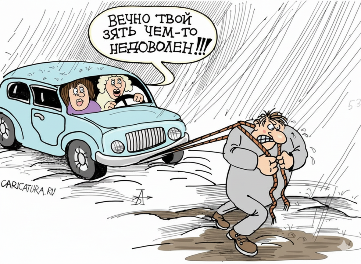 Юмор в этой теме работает безотказно. Само сочетание «зять и тёща» уже вызывает улыбку, потому что в нём слышится противоречие: официальное родство и неофициальное соперничество.