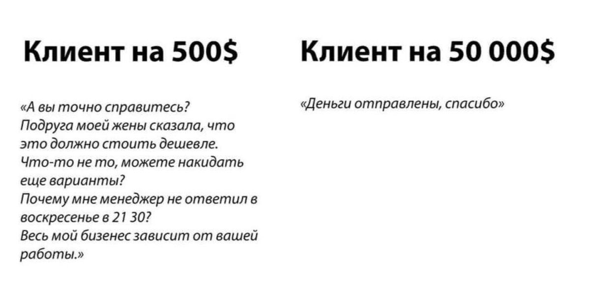 Ах, это классика психологии продаж и восприятия ценности! 😅 Давайте разберёмся, почему так происходит в недвижимости (и не только там): Эффект привязанной стоимости Люди меньше ценят то, за что платят копейки. Для клиента на $500 цена кажется «большой», и он начинает искать каждую мелочь, сомневаться, искать альтернативы. Для клиента на $50 000 сумма уже настолько велика, что он воспринимает её как инвестицию, а не как расход на разборку каждой детали. Психология риска Малые сделки кажутся «дешёвыми», поэтому страх потерять деньги кажется непропорционально большим. Большие сделки воспринимаются как «правильный шаг», риск уже оправдан потенциалом выгоды. Эффект «неважности» времени Малые клиенты часто хотят идеальный сервис 24/7, но их деньги не покрывают такой уровень внимания. Большие клиенты знают цену своему времени и вашему — они сразу платят и доверяют. Социальное сравнение Клиент на $500 слышал от подруги, соседей, интернет-форумов — «должно быть дешевле». Клиент на $50 000