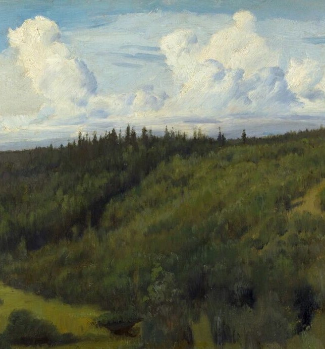 Васнецов Виктор Михайлович (1848-1926) «Пейзаж под Абрамцевом», (1881) Этюд Государственная Третьяковская галерея, (Москва) Эта скромная по размеру работа Виктора Васнецова — «Пейзаж под Абрамцевом» — стала частью большого пути к созданию монументального полотна «Богатыри». В этюде мы видим густые темно-зеленые холмы и мощные клубящиеся облака, которые словно предвещают ритмику и силу будущей картины. Васнецов писал этюды в Абрамцеве, где вместе с другими художниками Абрамцевского кружка искал опору в народных традициях и эпическом размахе русской природы. В этом простом мотиве ощущается монументальность: тишина холмов и тяжесть неба будто содержат в себе тот же дух, что и фигуры витязей на легендарной картине. Даже в «Пейзаже под Абрамцевом» зритель чувствует, что перед ним не просто этюд, а зародыш эпоса.