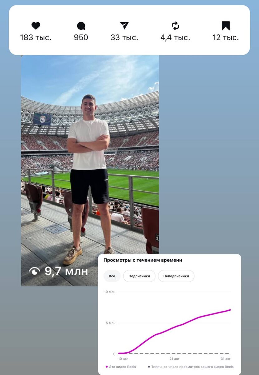 Мой новый рекорд! 9.700.000 просмотров на Reels 🤩 Принимаю поздравления)) Это тот самый ролик, о котором говорил вчера тут. Он уже принес 5000+ подписчиков, а я сэкономил пару миллионов на рекламе) Теперь рассказываю, как я сделал просмотры с население Москвы на одном ролике: 1️⃣ Формат, который удобно смотреть — в рисах более 30 форматов, которые можно использовать. Но я подхожу выборочно к определенной теме роликов, если мне нужно набрать больше просмотров и охватов. А самое главное, это удобный текстовый формат рилс, который сегодня находится в тренде. 2️⃣Широкая тема, которая попадает в запрос человека — многие пытаются снимать «умные» ролики, но они не залетают, потому что слишком узкая тема. Моя стратегия заключается в том, чтобы привлекать целевую аудиторию максимально широкими подачами, а уже далее внутри через контент и воронки, налаживать связь и взаимодействовать. 3️⃣Активация пользы — один из элементов, который влияет на продвижение контента - это сохранения. Большинс