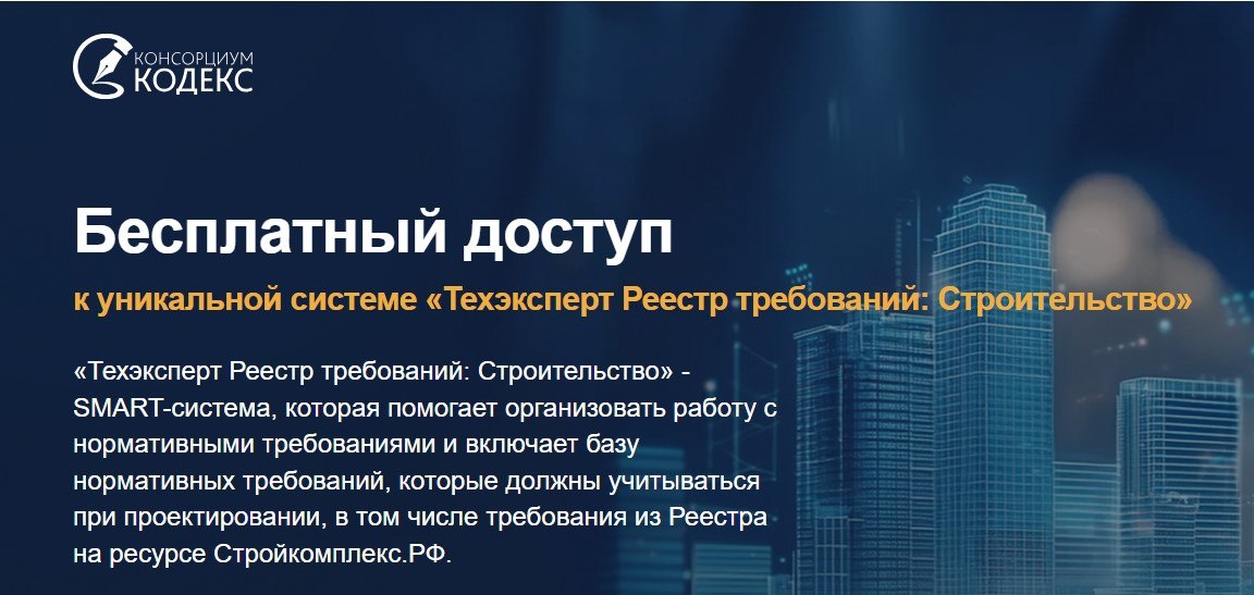 Бесплатный доступ на 7 дней к системе "Техэксперт Реестр требований: Строительство" С 1 марта 2026 года вступят в силу изменения в Градостроительный кодекс на основании ФЗ № 653-ФЗ от 25.12.2023. С этого момента экспертиза проектной документации будет проверять соответствие только требованиям, уже включенным в государственный Реестр на портале "Стройкомплекс.РФ". Акция продлится до 31 октября 2025 года. Подробные условия на сайте