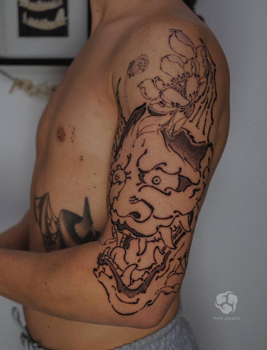 Начал рукав с демоном и лилиями. Уже немного покрасил. Еще обзавелся двумя новыми тату машинками, жду малышек 🐶