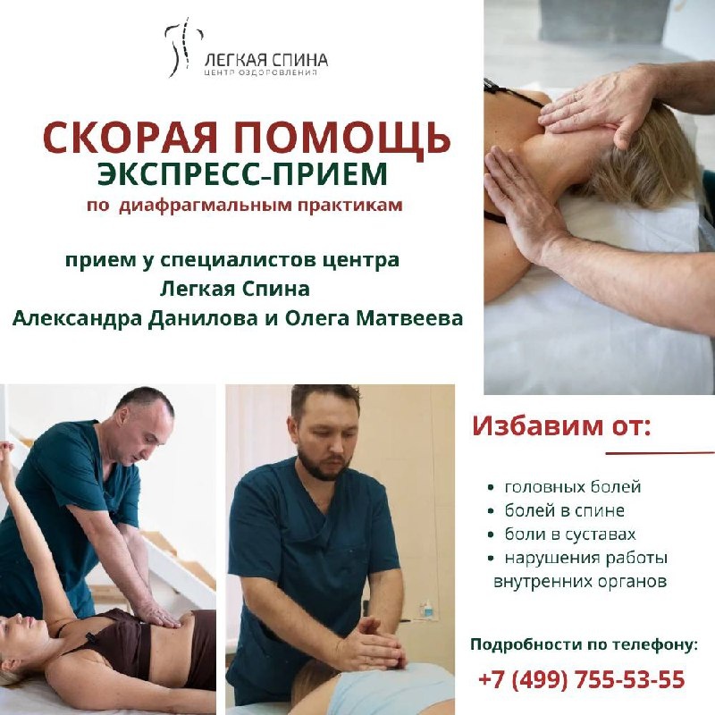🔥ЗНАКОМСТВО С МЕТОДИКОЙ Нам часто задают вопрос, что же представляют из себя диафрагмальные практики. 💡В центра Легкая Спина появилась уникальная возможность попробовать методику в формате экспресс-приема по сниженному тарифу и задать интересующие вопросы специалисту Что это значит? Если вы хотите понять, что такое диафрагмальные практики, то можете записаться на 15 мин. - экспресс-прием и специалист более детально поработает с вами и расскажет, что необходимо сделать в дальнейшем Когда хотя бы одна диафрагма в зажиме, напряжении, начинаются сбои во всем организме: ❌ боли в спине, шее, голове, мигрени и скачки давления, ❌ отёки и тяжесть в ногах, сбои в работе ЖКТ, ❌ снижение энергии и хроническая усталость. Специалисты центра устраняют причины проблемы, а не симптомы🌿 ✍️ Подробности по телефону +7 (499) 755-53-55