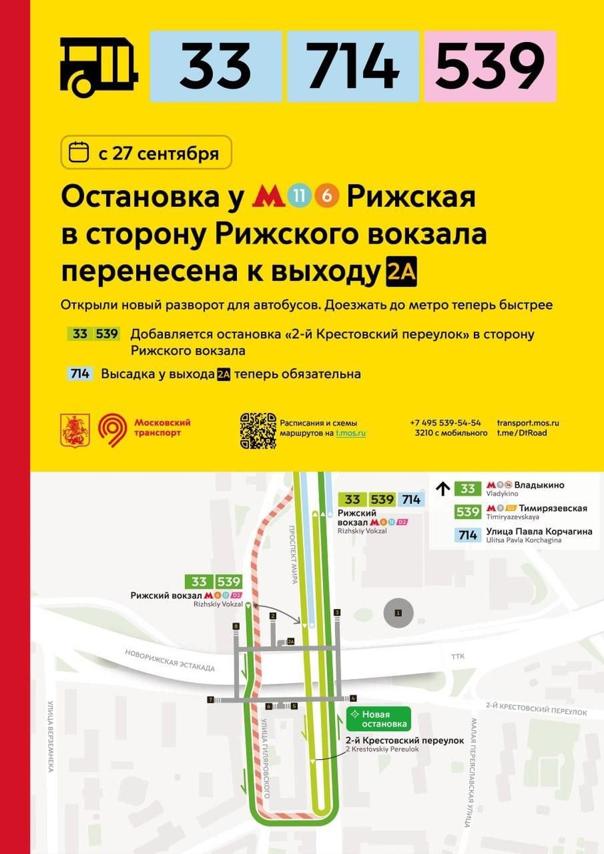 Уважаемые жители❗️ 🚍 С 27 сентября остановка у метро «Рижская» в сторону Рижского вокзала для маршрутов 33, 539 и 714 перенесена к выходу 2А. Это связано с открытием нового разворота для автобусов. Для маршрутов 33 и 539 добавляется остановка «2-й Крестовский переулок» в сторону Рижского вокзала. 🚫 На Цветном бульваре с 26 по 29 сентября временно ограничат движение в связи с проведением Московского детского велофестиваля. В эти дни будет частично или полностью перекрыт участок бульвара от Садового кольца до Петровского бульвара, а также запрещена парковка. Планируйте маршруты заранее!