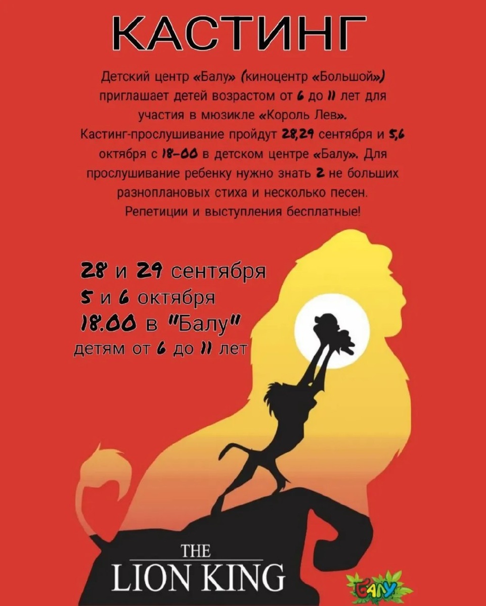 Детский центр «Балу» (киноцентр «Большой») приглашает детей возрастом от 6 до 11 лет для участия в мюзикле «Король Лев». Кастинг-прослушивание пройдут 28,29 сентября и 5,6 октября с 18-00 в детском центре «Балу». Для прослушивание ребенку нужно знать 2 не больших разноплановых стиха и несколько песен. Репетиции и выступления бесплатные! 🫠 Детские мероприятия Ростов-на-Дону. Я местный! 📱 Мероприятия Ростов-на-Дону. Я местный! в MAX
