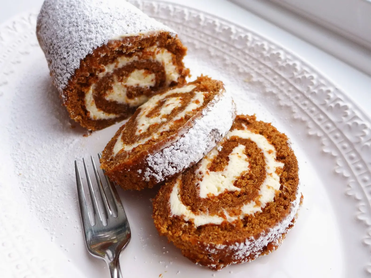 Запахло осенью... А значит пришло время вкусного ароматного чая и разнообразной домашней выпечки с яблоками, корицей и тыквой. Сегодня у нас как раз тыквенный рулет на повестке дня. Он такой ароматный и нежный, что устоять от третьего кусочка вам точно не удастся! стакан муки 0,5 стакана сахара 1 ч. л. мёда 3 яйца щепотка соли 0,5 ч. л. молотой корицы щепотка молотой гвоздики 0,5 ч. л. разрыхлителя 1 ч. л. ванильного сахара 0,5 ч. л. пищевой соды 1 стакан тыквенного пюре (тыкву нарезать кубиками и потушить до состояния пюре с 1 ст. л. воды) 100 гр. сахарной пудры щепотка соли 1 ч. л. ванильного сахара 300 гр. мягкого не зернистого творога жирностью 2-5% 150 гр. жирной сметаны Разогрейте духовку до 180 градусов.