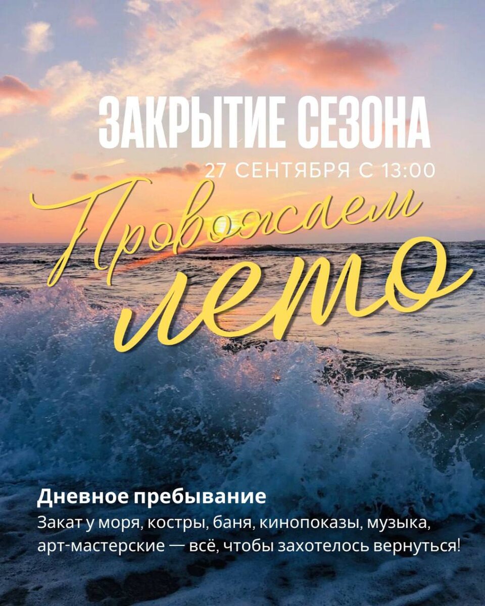 Закрытие сезона: 27 сентября провожаем лето красиво! 🍂 Есть в последних тёплых днях сентября особая магия… Балтика ещё хранит дыхание лета, но воздух уже прохладнее, а закаты - огненнее. И именно в такой день мы зовём вас на закрытие сезона в «Территорию Я», чтобы не грустить, а прожить этот день ярко, чтобы хотелось повторить его снова и снова. ☀️ Днём будем творить: — 🎨 Напишем морской пейзаж с популярной студией Salvador прямо на берегу: закат, волны и холст под руками. — 💎 Создадим украшения из янтаря. Солнечный камень в ваших руках обретёт новую жизнь и станет символом этого лета. А ещё вас ждёт баня на берегу моря, костёр, музыка, разговоры под звёздами и то самое чувство, когда хочется быть здесь и сейчас, никуда не спешить и запомнить каждую деталь. ⛺️ Если захочется остаться, только 27.09 скидка 50% на наши теплые белл-тенты. Пение птиц, уют, тепло и звуки моря убаюкивают лучше любых колыбельных. Стоимость: 🎨 МК «Морской пейзаж»: 700₽ 💎 МК «Украшения из янтаря»: 500₽