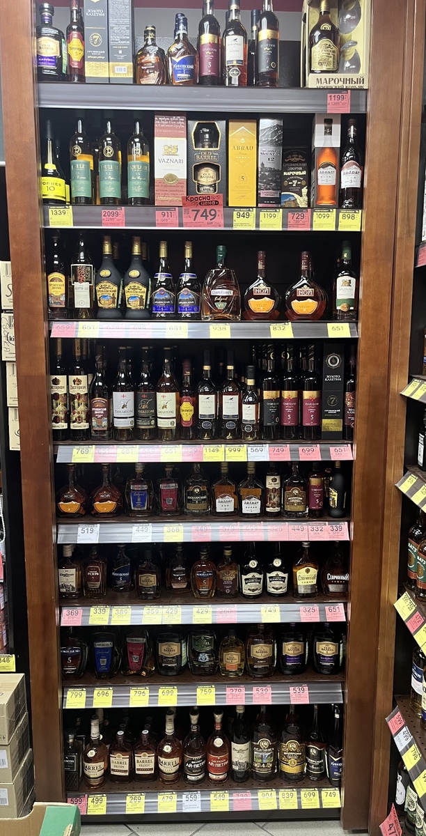 Еще ни разу ничего не покупал в этой сети, их всего 60 на весь СПб. Для сравнения, КиБ — 830 магазинов. Так выглядит полка в магазине в спальном районе. Давайте пробежимся по полкам и поищем что-то застольное, а может и для самостоятельного употребления. Слева направо: Торрес - цена сопоставима с КиБ. Только пусть вас не вводит в заблуждение цифра 10, это просто название, а реальный средний возраст спиртов дай бог, если перевалит за 3 года (солера творит маркетинговые чудеса). Рулле VS, за 1–1,3к вполне застольный вариант. Платинум 12 лет, застольный вариант до 1000р. Шахназярян славится застольными коньяками, причем от 12 до 20 лет, цена примерно одинаковая. В сети «ДА» они всегда стоили 999. Отличительная особенность – ярко шоколадные нотки, но шоколад не самого лучшего качества. Армянский дворик 7. Запомните, если название коньяка содержит слово «Армянский» (дворик, сад, дворец, сарай, ослик), то с 95% вероятностью там «шмурдяк» с ванильно-шоколадным уклоном (ароматизаторами). Ар