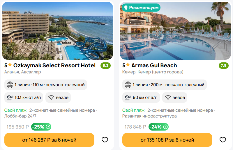🔥Туры в Турцию "всё включено" из Санкт-Петербурга от 6 ночей 🔥 Парочка выгодных вариантов: Тур в отель 5⭐️Club Hotel Anjeliq, до пляжа 200 м, Аланья, Конаклы, от 6 ночей, ультра всё включено, прямой чартерный. Вылет 30 сентября, от 59486 руб/чел Забронировать: https://checkintime.ru/w8w4 Тур в отель 5⭐️Armas Gul Beach, до пляжа 200 м, Кемер, от 6 ночей, ультра всё включено, прямой чартерный. Вылет 30 сентября, от 67554 руб/чел Забронировать: https://checkintime.ru/mo5h Тур в отель 5⭐️Ozkaymak Select Resort Hotel, до пляжа 110 м, Аланья, Авсаллар, от 6 ночей, ультра всё включено, прямой чартерный. Вылет 30 сентября, от 73144 руб/чел Забронировать: https://checkintime.ru/rncq Все предложения: https://checkintime.ru/6iua ⚠️Цены на момент публикации и указаны на одного человека с перелетом и проживанием. Переходя по ссылке цена отобразиться на 2-х человек 🏖 Поиск туров | ✈️Авиабилеты