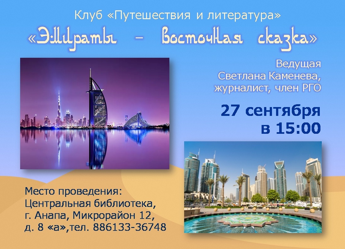 Центральная библиотека приглашает вас на встречу в рамках клуба «Путешествия и литература» 27 сентября — «Эмираты — восточная сказка». Ведущая Светлана Каменева, журналист, путешественница, член Российского географического общества, расскажет об Арабских Эмиратах. Вы узнаете основные факты о стране, её географии, культуре и современной жизни, а также интересные моменты из личного опыта Светланы.