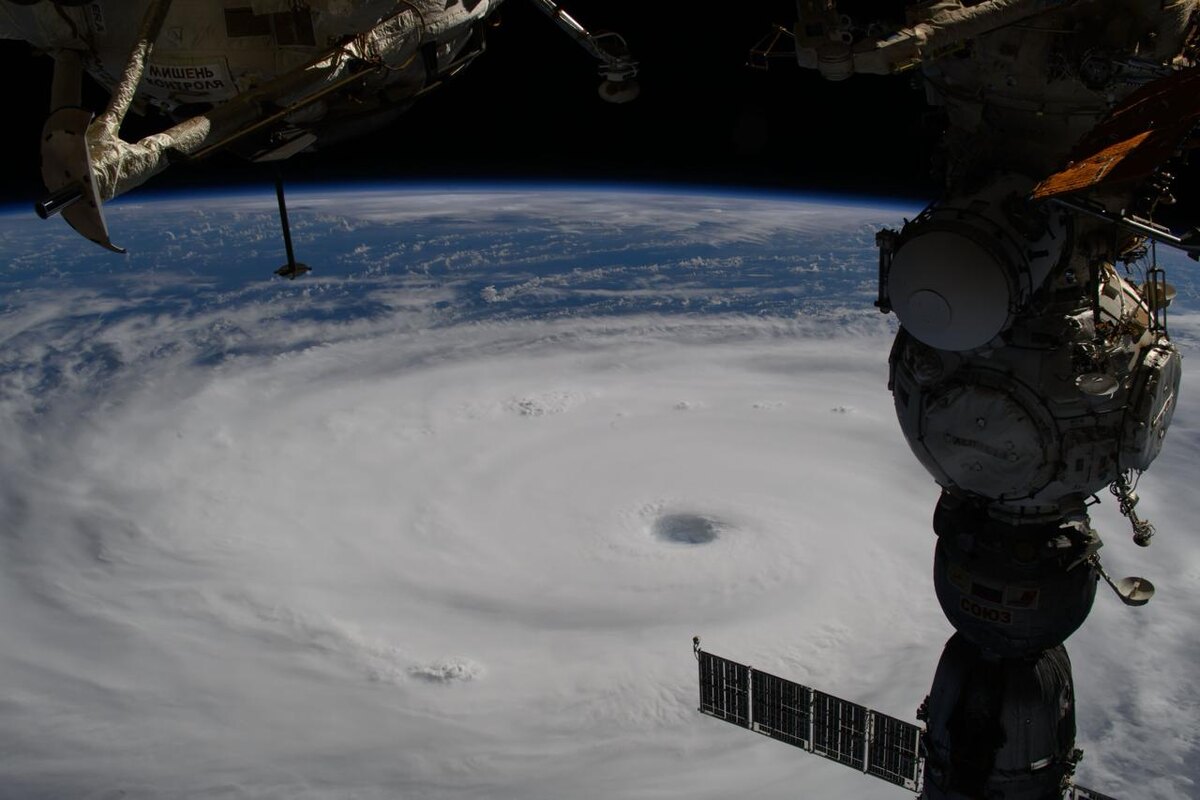 Обратите внимание на глаз бури — область прояснения и относительно тихой погоды в центре тропического циклона. Обычно его диаметр составляет несколько десятков километров.