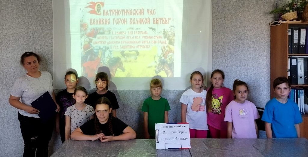 В рамках Дня разгрома монголо-татарской орды под руководством Дмитрия Донского (Куликовская битва 1380 года), в Год защитника Отечества в клубе «Алмазный» состоялся патриотический час «Великие герои великой битвы». Во время мероприятия участники познакомились с героическим прошлым нашей страны. Узнали о великом ратном подвиге, о первой значимой победе наших предков над войском Золотой орды. Ребята с интересом слушали рассказ о князе Дмитрии Донском, поднявшем русских людей на битву с врагом. Запомнили дети и подвиг монаха Пересвета.