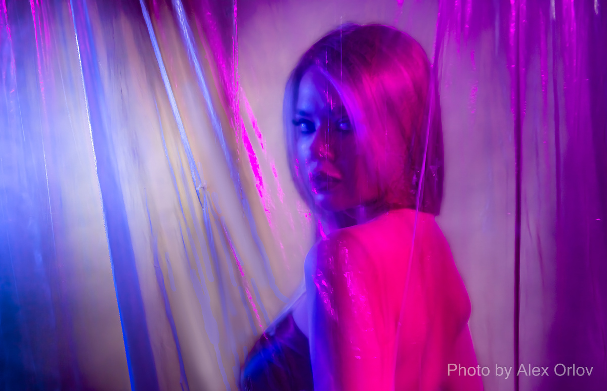 Здравствуйте уважаемые подписчики и читатели канала. Большое спасибо за ваше внимание к моему творчеству. У одного фотографа подсмотрел идею. А если конкретно, то использование тонкой полиэтиленовой пленки вкупе со светильниками RGB. Складки от свисающей пленки, подсвеченные светильниками, дают интересный эффект. Приступаем. Располагаю светильники, как перед пленкой, так и за ней. Потому как разный свет воспринимается по разному. Яркость получается разная. Кроме того, фон подсвечивался отдельным светодиодным источником. Регулируя температуру, можно добиться разного эффекта. И так. Эксперимент первый. Исключительно постоянный свет. На этом кадре было четыре источника. Синий и пурпурный. Не стал уводить пурпур в красный. Пусть цвета будут близкими. Первый источник (синий) за пленкой, второй перед. На фон светил белым с температурой, как сейчас помню, 4000 К. Ну и через пленку пытался подсветить модель от пилотного света, сведя его яркость к минимуму. На то была веская причина. Без подсве