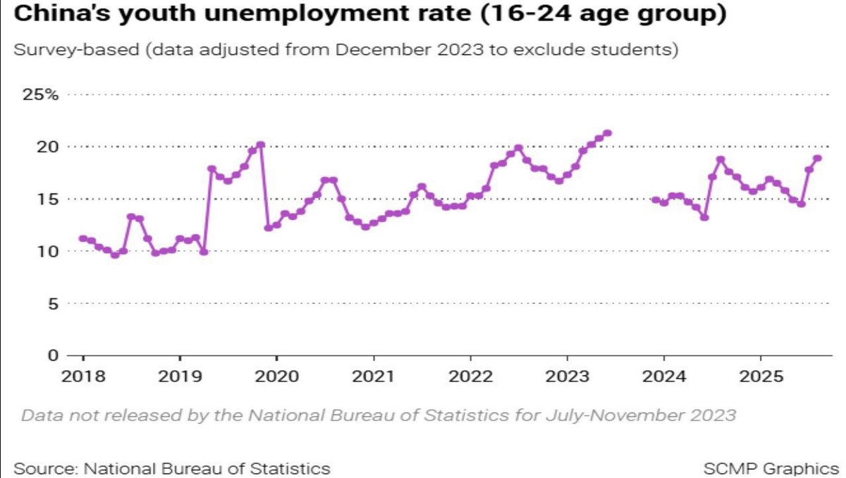 Уровень безработицы среди китайской молодёжи (16–24 года, без учёта студентов) в августе достиг 18,9% — это рекордный показатель с момента изменения методики подсчёта в 2023 году. Среди работников 25–29 лет показатель также вырос, до 7,2% против 6,9% месяцем ранее. Напомним, в июне 2023 года безработица среди молодых достигла исторического максимума в 21,3%. После этого власти на пять месяцев приостановили публикацию статистики, а в декабре ввели новую методику расчёта. По старым стандартам нынешний уровень, вероятно, составил бы около 22–23%. Летом 2025 года китайский рынок труда испытал дополнительное давление: около 12,2 млн выпускников университетов вышли на поиск работы. Большинство из них сталкиваются с трудностями при трудоустройстве по специальности и с низким спросом на квалифицированный труд на фоне дефляционного давления и внешней неопределённости. Для сравнения: в Германии, также ориентированной на экспорт, уровень молодёжной безработицы в 2025 году остаётся заметно ниже —