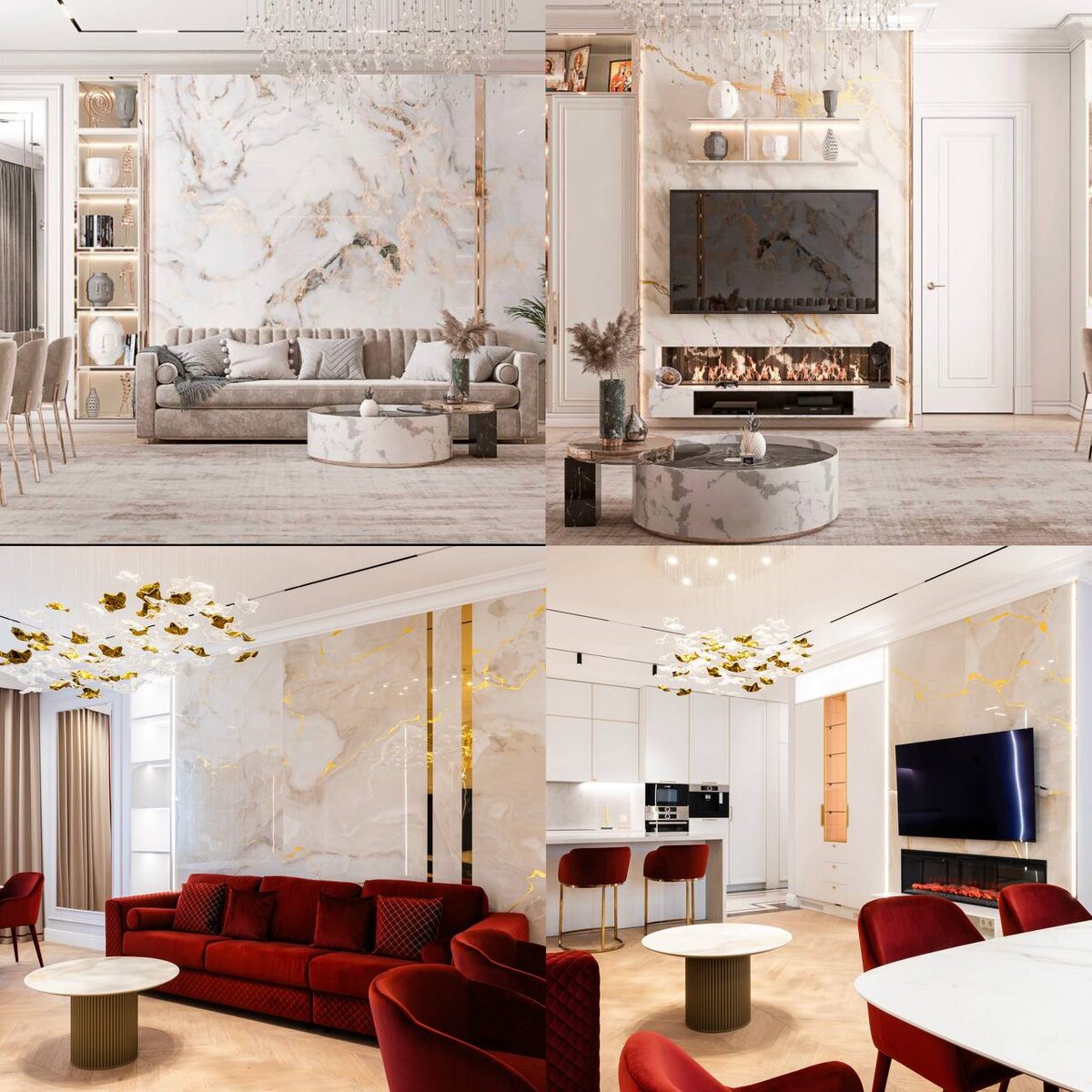 Кухня-гостиная Большое пространство, где можно посидеть, как за барной стойкой на кухне, так и за обеденным столом. Также разместили ТВ-зону с камином для уюта 🔥