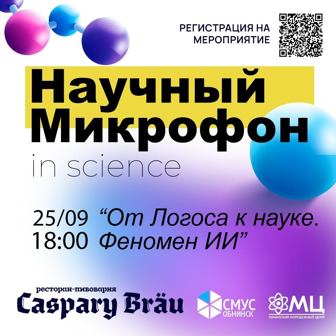 25 сентября встречаемся на «Научном микрофоне»! «Научный микрофон» – уникальное место встречи для всех, кто интересуется научными исследованиями, хочет получить новые знания и провести время в неформальной дружеской атмосфере. В этот раз обсудим тему «От Логоса к науке. Феномен ИИ»: что такое искусственный интеллект сегодня, как работает машинное обучение, нейросети и большие языковые модели, где грань между обработкой данных и сознанием, какие вызовы и возможности несёт нам развитие ИИ. После дискуссии пройдёт интеллектуальная игра. Дата и время: 25 сентября в 18:00. Место: Caspary Brau (ул. Королёва, 6). Предварительная регистрация командная – состав от трёх человек: https://clck.ru/3PP8wW #обнинскнаучный #молодёжьобнинска