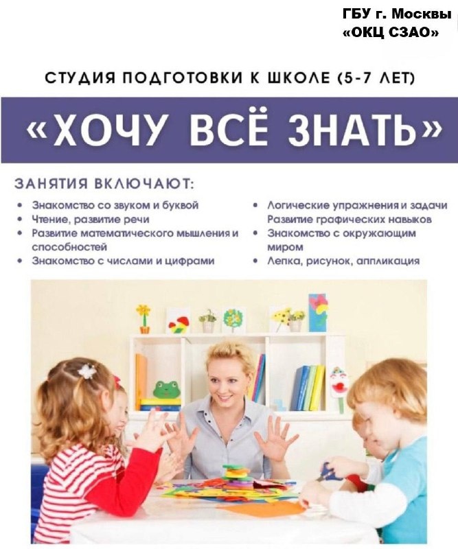 ✨ Приглашаем в студию подготовки к школе «Хочу всё знать» ✨ 📚 В программе: • 📖 ЧТЕНИЕ • ➕ МАТЕМАТИКА • ✍️ ПОДГОТОВКА РУКИ К ПИСЬМУ • 🗣 РАЗВИТИЕ РЕЧИ • 🌍 ОКРУЖАЮЩИЙ МИР 👩🏫 Занятия проводит опытный педагог — Чиркова Яна Александровна 🕒 Расписание занятий: • Среда — 17:00–18:00 • Пятница — 17:30–18:30 💰 Стоимость: • Абонемент на 4 занятия — 3300₽ • Абонемент 2 раза/нед — 5500₽ • Разовое занятие — 1100₽ 📍 Адрес: Ул. Вилиса Лациса, д.11, корп.3 📞 Запись по телефону: +7 (495) 495-91-10 #подготовкакшколе #дети #развитиедетей #образование #Москва #занятиядлядетей #гбуокцсзао