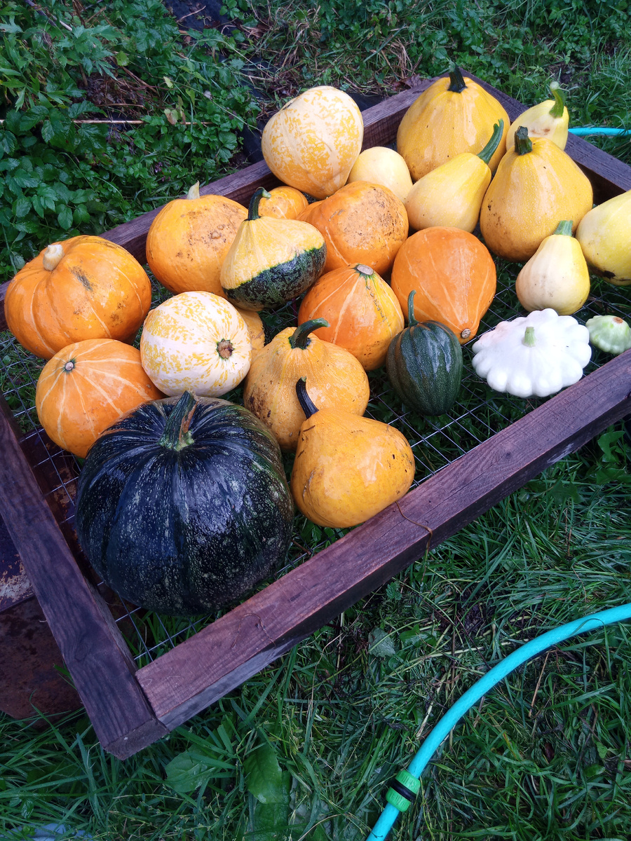 То-ли себе, то-ли производителям семян. 🤔 Здрасти. Заняться вам нечем, что ли? Шляетесь тут туды-сюды, туды-сюды. 🙄 Сеня ночью обещають минус один. Хотел рубить капусту, а пришлось собирать тыкву.. 🎃 Собрал! А то как же. Эвоно скока, 🤦♂️ Вот только загадка где что? 🤔 Вроде всё подписано, написано, записано, а толку? Ноль! Пойдём от противного. Посажено было 4 сорта тыквы. Два понятно. Маленький зелёный это аккорн желудёвый. Подарок! С самой Кубани! 😜От девушки! Во!Большая зелёная слева это абрикосовая голосеменная, недозрела зараза! 🤬 Ладно, будем ждать, может дозреет. А так хотелось абрикосового сока испить! 😋 Ну, тут либо сок, либо семена. Поколение Икс выбирает семена! 🥳🥳🥳 Ладно, идём дальше. Это вот непонятное, жёлтое, грушевидное справа на первом фото, на мой взгляд патиссоны. Дело в том, что я купил набор семян патиссон "Весёлые ребята". А там они вперемешку, не подписаны. Ну, подумал я, патиссоны они и есть патиссоны. Кто ж знал что они могут быть похожи на тыкву