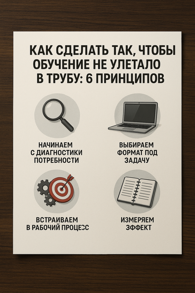 Проблема в том, что обучение делают «в общем», а не «под задачу». В итоге знания не применяются и вылетают в трубу. Чтобы этого не происходило, стоит придерживаться шести базовых принципов. 1. Начинаем с диагностики потребности Обучение должно решать конкретную задачу бизнеса. 📌 Формула простая: нет запроса → нет обучения. 2. Формулируем ожидаемый результат “Повысить квалификацию” — не цель.