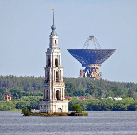 Если были в Тверской области, в районе Угличского водохранилища, не могли не заметить огромную металлическую чашу, рядом с которой стоит одиноко торчащая колокольня Никольского собора. Это Калязинский радиотелескоп РТ-64. Не просто научный инструмент, а свидетель драмы, триумфа и надежд отечественной науки. Судьба телескопа неразрывно связана с трагедией древнего города Калязина. В 1939 году, в рамках масштабного проекта по созданию Волжского каскада, старинная часть города была приговорена к затоплению. Под воду ушли сотни домов, храмов и целые улицы. Чудом уцелела лишь колокольня, оставленная как навигационный знак. А спустя два десятилетия, в конце 1950-х годов, на искусственном островке рядом с ней началось строительство уникального астрономического объекта. Место было выбрано не случайно: удаленность от крупных городов обеспечивала низкий уровень радиопомех, а гладь водохранилища создавала идеально ровную поверхность для распространения радиоволн. Так на месте ушедшей на дно жи