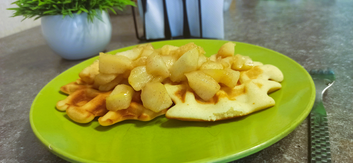 На готовые вафли выкладываем яблоки, и тут начинается блаженство, а завтрак или полдник превращается в маленький праздник 🥰.