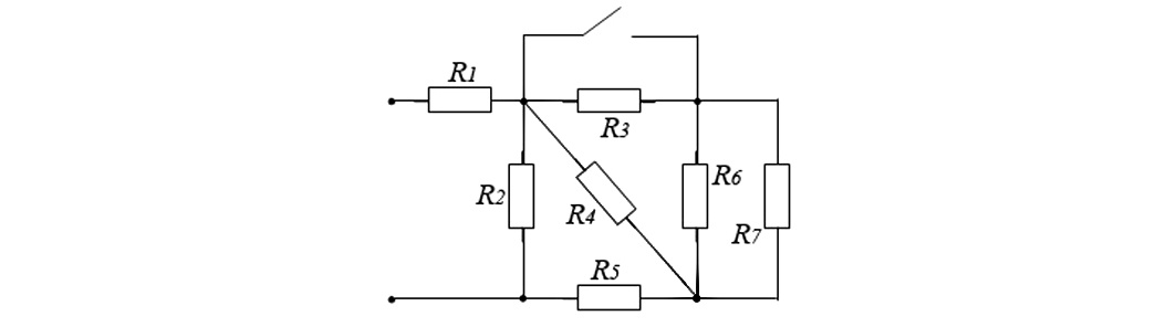 Для нахождения эквивалентного сопротивления цепи необходимо сворачивать схему, начиная с наиболее удалённых от входных зажимов ветвей, последовательно заменяя участки цепи их эквивалентными сопротивлениями. Процесс продолжается до тех пор, пока вся схема не будет сведена к одному результирующему сопротивлению между заданными выводами. Метод эквивалентных преобразований особенно удобен для анализа пассивных цепей, содержащих только резистивные элементы, соединённые последовательно и параллельно. Решение: 1. Резисторы R₆ и R₇ включены параллельно: После преобразования сопротивления R₆₇, схема цепи имеет следующий вид: 2. Резисторы R₃ и R₆₇ включены последовательно: После преобразования сопротивления R₃₆₇, схема цепи имеет следующий вид: 3. Резисторы R₄ и R₃₆₇ включены параллельно: После преобразования сопротивления R₃₄₆₇, схема цепи имеет следующий вид: 4. Резисторы R₅ и R₃₄₆₇ включены последовательно: После преобразования сопротивления R₃₄₅₆₇, схема цепи имеет следующий вид: 5. Резистор