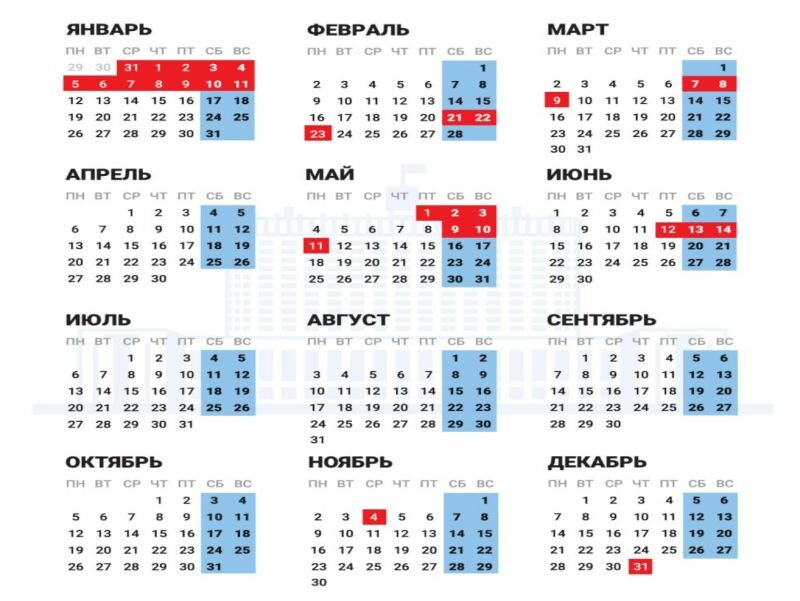 Выходными будут дни с 31 декабря 2025 года по 11 января 2026 года (Новый год и Рождество), с 21 по 23 февраля (День защитника Отечества), с 7 по 9 марта (Международный женский день), с 1 по 3 мая (День труда) и с 9 по 11 мая (День Победы), с 12 по 14 июня (День России), 4 ноября (День народного единства) и 31 декабря (Новый год).