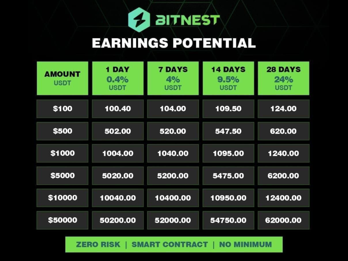 Стоит отметить, что механизм смарт-контрактов на платформе BitNest гарантирует, что средства будут автоматически отправлены на ваш зашифрованный адрес кошелька в конце инвестиционного цикла. По истечении срока ваши средства и прибыль будут автоматически переведены обратно без каких-либо действий с вашей стороны.