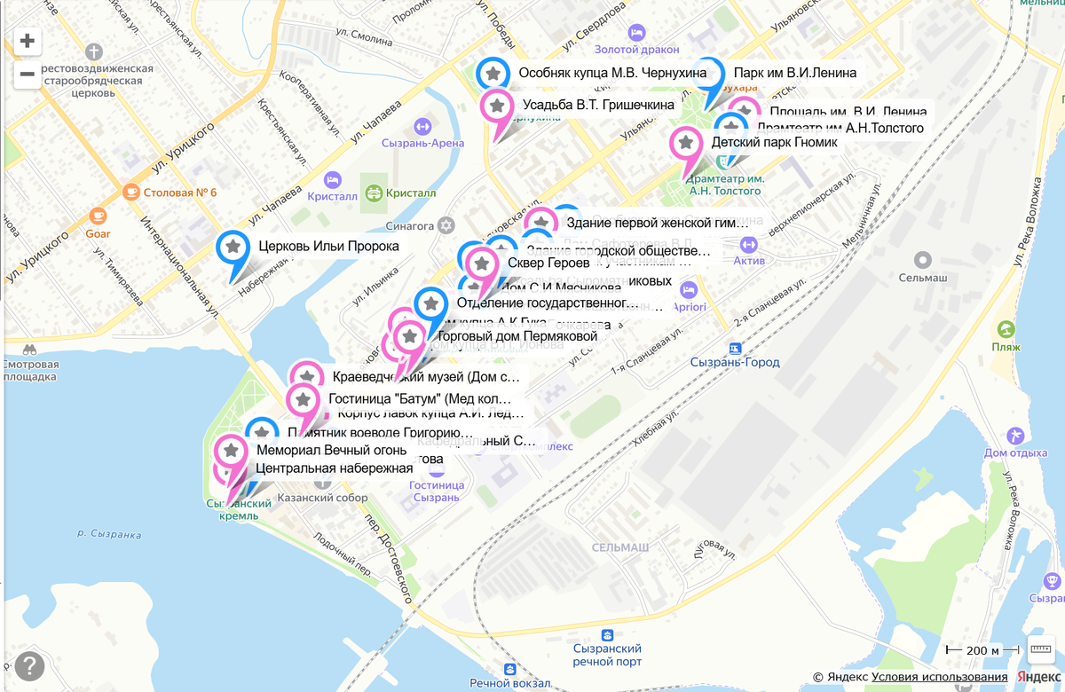 Прогулка по Сызрани и знакомство с основными достопримечательностями не займет у Вас много времени, все здесь расположено достаточно компактно. Все самое интересное находится в самом центре города на улице Советской ( бывшей Большой) и на прилегающих к ней улицам. Для наглядности покажу на карте путь следования, куда я внесла все объекты для посещения.