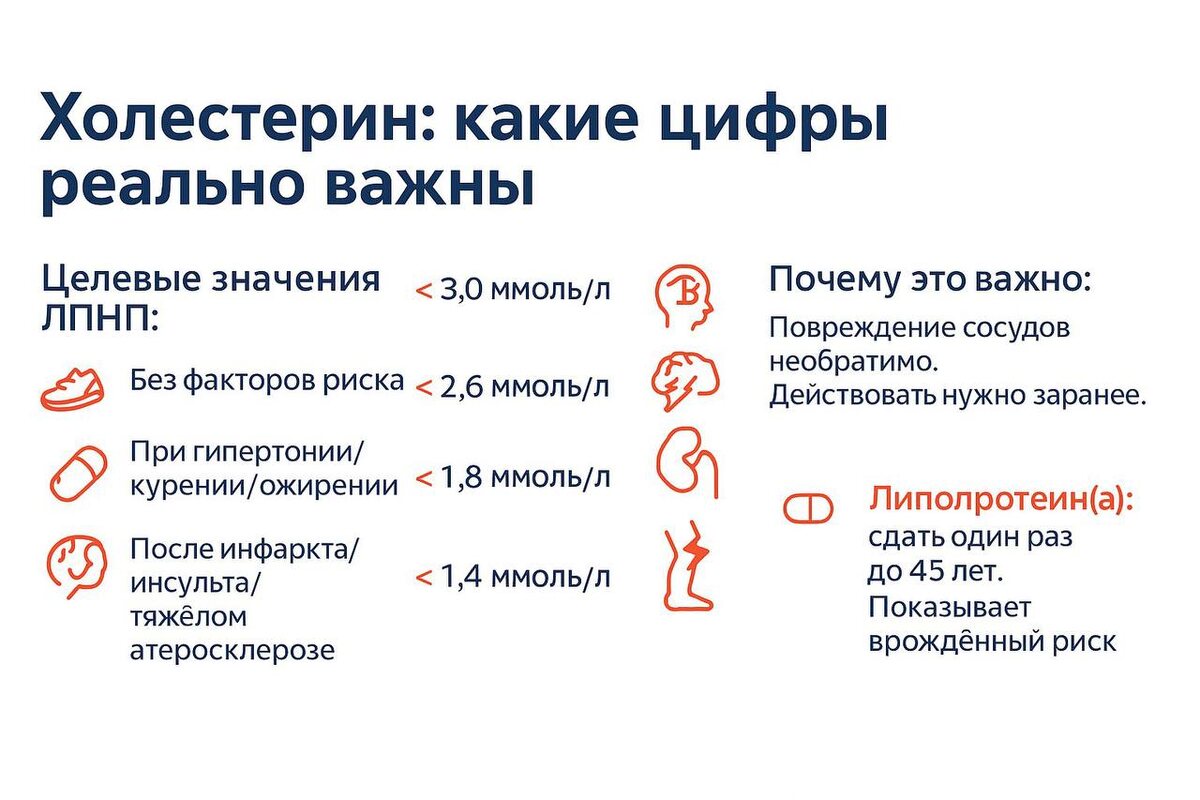 «У вас холестерин в норме» — самая опасная фраза 🆘 В моей практике часто одно и то же: Пациент с общим холестерином 5,6 ммоль/л уверенно говорит: «Доктор, у меня всё хорошо, мне уже 10 врачей сказали, что холестерин нормальный». Но смотришь глубже — ЛПНП = 3,5 ммоль/л. 👉 А это не «норма». Это прямая дорога к атеросклерозу сосудов. Какие цифры реально безопасны? - Без факторов риска: ЛПНП < 3,0 ммоль/л - С гипертонией, курением, лишним весом: ЛПНП < 2,6 ммоль/л - Если уже был инфаркт, инсульт или диабет: ЛПНП < 1,8 ммоль/л - При повторных инфарктах и тяжёлом атеросклерозе: ЛПНП < 1,4 ммоль/л ⚠️ Что будет, если верить «общему холестерину»: ・ Инсульт или инфаркт в 50 лет, ・ Атеросклероз ног и постоянная боль при ходьбе, ・ Шум в голове, головокружения, ・ Деменция из-за «забитых» сосудов. Именно поэтому семьи врачей живут дольше. Они не смотрят на цифру в референсе, а: ・ Контролируют ЛПНП, начинают борьбу с холестерином вовремя — потому что последствия необратимы. ・ Оценивают факторы