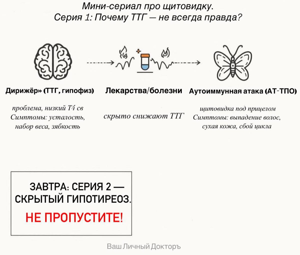 π¬ Π©ΠΈΡΠΎΠ²ΠΈΠ΄ΠΊΠ°: ΠΌΠΈΠ½ΠΈ-ΡΠ΅ΡΠΈΠ°Π», ΡΠ΅ΡΠΈΡ 1 ΠΠΎΡΠ΅ΠΌΡ Π’Π’Π Π½Π΅ Π²ΡΠ΅Π³Π΄Π° ΠΎΡΡΠ°ΠΆΠ°Π΅Ρ ΡΠ°Π±ΠΎΡΡ ΡΠΈΡΠΎΠ²ΠΈΠ΄ΠΊΠΈ? ΠΡΠ΅ Π·Π½Π°ΡΡ: Π²ΡΡΠΎΠΊΠΈΠΉ Π’Π’Π = Π³ΠΈΠΏΠΎΡΠΈΡΠ΅ΠΎΠ·, Π½ΠΈΠ·ΠΊΠΈΠΉ = ΡΠΈΡΠ΅ΠΎΡΠΎΠΊΡΠΈΠΊΠΎΠ·. ΠΠΎ ΡΡΠΎ, Π΅ΡΠ»ΠΈ Π’Π’Π Π² Π½ΠΎΡΠΌΠ΅, Π° ΡΠΈΠ» Π²ΡΡ ΡΠ°Π²Π½ΠΎ Π½Π΅Ρ? π ΠΠΎΠ³Π΄Π° ΡΠ°ΠΊ Π±ΡΠ²Π°Π΅Ρ: 1. Π‘Π±ΠΎΠΉ Π² Β«Π΄ΠΈΡΠΈΠΆΡΡΠ΅Β» (Π³ΠΈΠΏΠΎΡΠΈΠ·Π΅) Π’Π’Π Π² Π½ΠΎΡΠΌΠ΅, Π° Π’4ΡΠ² ΡΠ½ΠΈΠΆΠ΅Π½. Π‘ΠΈΠΌΠΏΡΠΎΠΌΡ: ΡΡΡΠ°Π»ΠΎΡΡΡ, ΡΠΎΠ½Π»ΠΈΠ²ΠΎΡΡΡ, Π½Π°Π±ΠΎΡ Π²Π΅ΡΠ°, Π·ΡΠ±ΠΊΠΎΡΡΡ. 2. ΠΠ΅ΠΊΠ°ΡΡΡΠ²Π° ΠΈ Π±ΠΎΠ»Π΅Π·Π½ΠΈ ΠΠ»ΡΠΊΠΎΠΊΠΎΡΡΠΈΠΊΠΎΠΈΠ΄Ρ, Π΄ΠΎΡΠ°ΠΌΠΈΠ½, ΡΡΠΆΡΠ»ΡΠ΅ ΠΎΠΏΠ΅ΡΠ°ΡΠΈΠΈ ΠΈΠ»ΠΈ ΠΈΠ½ΡΠ΅ΠΊΡΠΈΠΈ ΠΌΠΎΠ³ΡΡ Β«ΠΏΡΠΈΠ΄Π°Π²ΠΈΡΡΒ» Π’Π’Π ΠΈ ΡΠΊΡΡΡΡ ΠΏΡΠΎΠ±Π»Π΅ΠΌΡ. 3. ΠΡΡΠΎΠΈΠΌΠΌΡΠ½Π½Π°Ρ Π°ΡΠ°ΠΊΠ° (ΠΠ’-Π’ΠΠ) ΠΡΡΠΎΠΊΠΈΠ΅ Π°Π½ΡΠΈΡΠ΅Π»Π° = ΡΠΈΡΠΎΠ²ΠΈΠ΄ΠΊΠ° ΡΠΆΠ΅ ΠΏΠΎΠ΄ ΠΏΡΠΈΡΠ΅Π»ΠΎΠΌ (Π₯Π°ΡΠΈΠΌΠΎΡΠΎ). ΠΠ°ΠΆΠ΅ Π΅ΡΠ»ΠΈ Π³ΠΎΡΠΌΠΎΠ½Ρ Π² Π½ΠΎΡΠΌΠ΅, ΠΏΡΠΎΡΠ΅ΡΡ ΠΈΠ΄ΡΡ. Π‘ΠΈΠΌΠΏΡΠΎΠΌΡ: ΡΠ»Π°Π±ΠΎΡΡΡ, ΡΡΡ