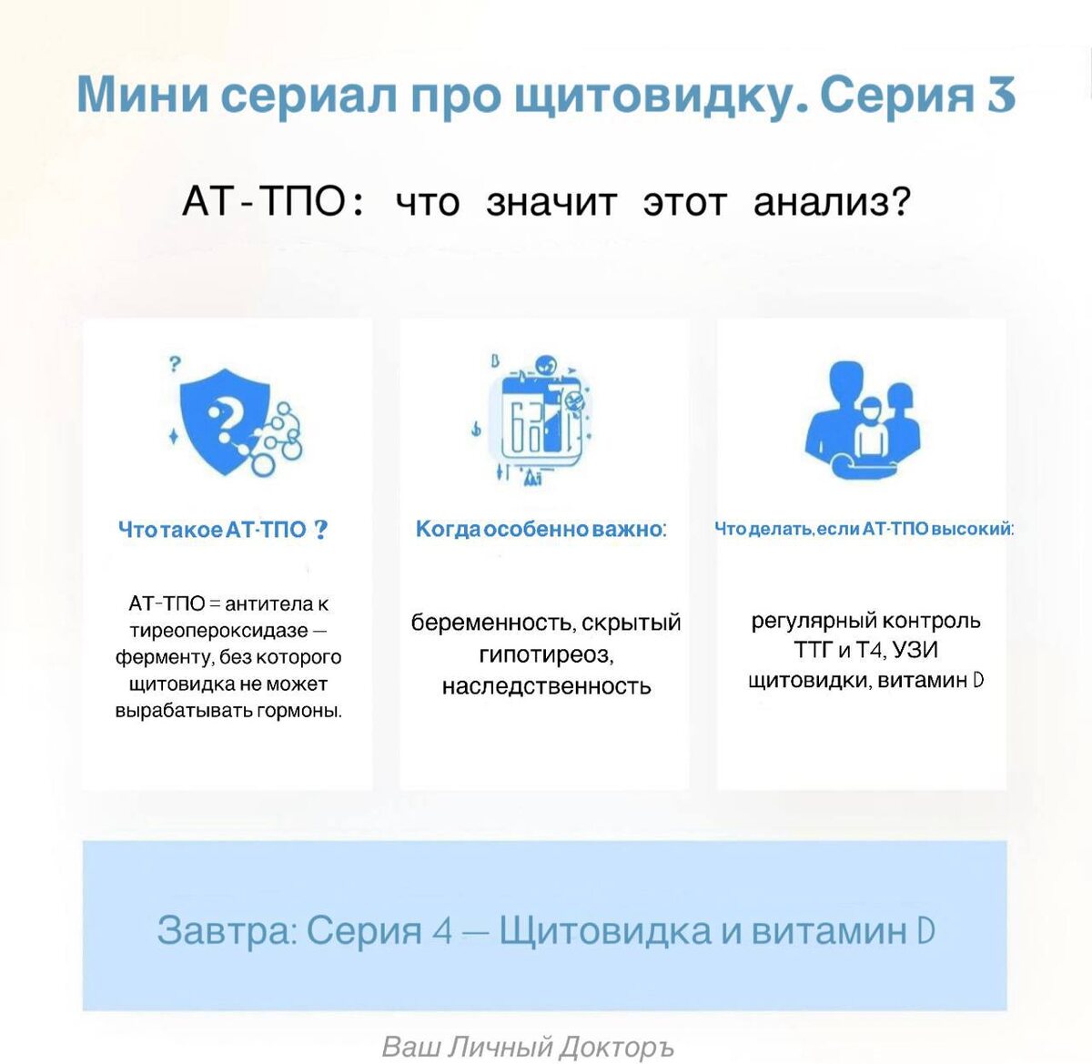 🎬Серия 3. АТ-ТПО: что значит этот анализ и зачем его сдавать? Все слышали про ТТГ, но гораздо реже — про антитела к щитовидке. Между тем, именно они часто «первыми» сигналят о проблеме. Что такое АТ-ТПО? АТ-ТПО = антитела к тиреопероксидазе — ферменту, без которого щитовидка не может вырабатывать гормоны. Если антитела высокие → иммунитет атакует собственную железу. Факт: У 10–15% здоровых людей находят повышенный АТ-ТПО. Но если они есть → риск развития гипотиреоза в будущем возрастает в 2–3 раза. Когда особенно важно сдать АТ-ТПО: • Планирование беременности и ЭКО 🤰 (антитела могут повышать риск выкидыша и послеродового тиреоидита). • Скрытый гипотиреоз (ТТГ слегка повышен, а Т4св в норме). • Есть наследственность по щитовидке. • Симптомы без объяснения: хроническая усталость, сухая кожа, выпадение волос, депрессия. Что делать, если АТ-ТПО высокий? • Это не приговор, но сигнал к регулярному контролю ТТГ и Т4 (1 раз в 6–12 мес). • Имеет смысл сделать УЗИ щитовидной железы. • По