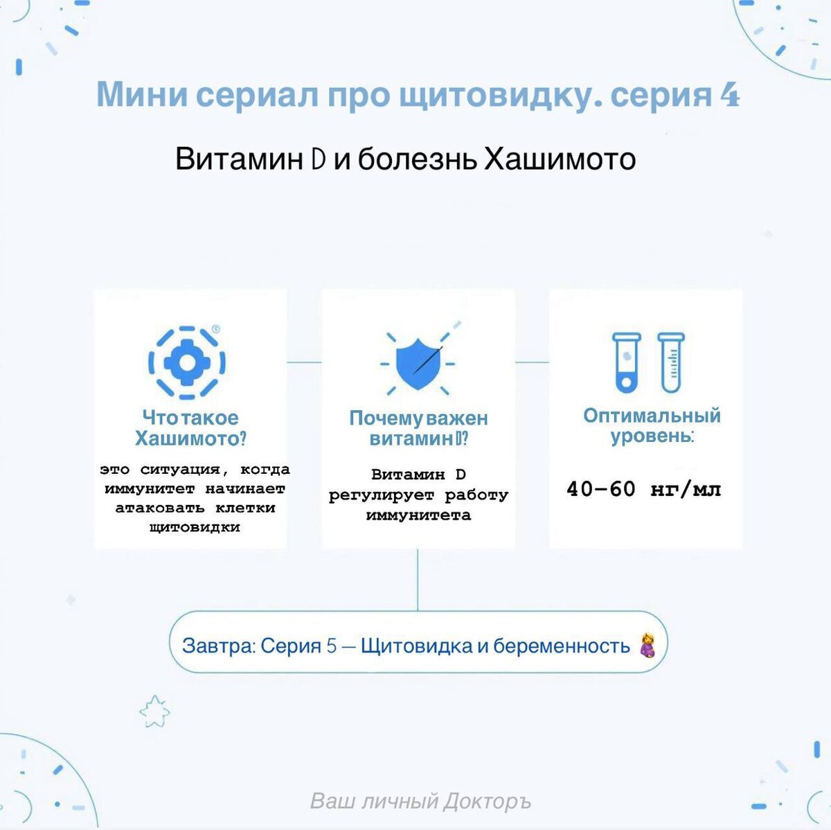 Π’Π’Π ΠΈ Π’4 ΠΌΠΎΠ³ΡΡ Π±ΡΡΡ Β«Π½ΠΎΡΠΌΠ°Π»ΡΠ½ΡΠΌΠΈΒ», Π½ΠΎ Π°Π½ΡΠΈΡΠ΅Π»Π° (ΠΠ’-Π’ΠΠ) ΡΠΆΠ΅ ΠΏΠΎΠ²ΡΡΠ΅Π½Ρ. ΠΠ΄Π΅ Π·Π΄Π΅ΡΡ Π²ΠΈΡΠ°ΠΌΠΈΠ½ D? β’ ΠΠΈΡΠ°ΠΌΠΈΠ½ D ΡΠ΅Π³ΡΠ»ΠΈΡΡΠ΅Ρ ΡΠ°Π±ΠΎΡΡ ΠΈΠΌΠΌΡΠ½ΠΈΡΠ΅ΡΠ°. β’ ΠΡΠΈ Π΅Π³ΠΎ Π΄Π΅ΡΠΈΡΠΈΡΠ΅ Π°Π½ΡΠΈΡΠ΅Π»Π° Π°ΠΊΡΠΈΠ²Π½Π΅Π΅ Π°ΡΠ°ΠΊΡΡΡ ΡΠΈΡΠΎΠ²ΠΈΠ΄ΠΊΡ. β’ ΠΡΡΠ»Π΅Π΄ΠΎΠ²Π°Π½ΠΈΡ ΠΏΠΎΠΊΠ°Π·ΡΠ²Π°ΡΡ: Ρ Π»ΡΠ΄Π΅ΠΉ Ρ ΠΠΠ’ ΡΠ°ΡΠ΅ Π²ΡΡΡΠ΅ΡΠ°Π΅ΡΡΡ Π½ΠΈΠ·ΠΊΠΈΠΉ Π²ΠΈΡΠ°ΠΌΠΈΠ½ D, Π° Π΅Π³ΠΎ ΠΊΠΎΡΡΠ΅ΠΊΡΠΈΡ ΠΏΠΎΠΌΠΎΠ³Π°Π΅Ρ Β«ΡΡΠΏΠΎΠΊΠΎΠΈΡΡΒ» Π°ΡΡΠΎΠΈΠΌΠΌΡΠ½Π½ΡΠΉ ΠΏΡΠΎΡΠ΅ΡΡ. π ΠΠ°ΠΊΠΎΠΉ ΡΡΠΎΠ²Π΅Π½Ρ ΡΡΠΈΡΠ°ΡΡ Π½ΠΎΡΠΌΠ°Π»ΡΠ½ΡΠΌ? β’ <20 Π½Π³/ΠΌΠ» β Π΄Π΅ΡΠΈΡΠΈΡ. β’ 20β30 Π½Π³/ΠΌΠ» β Π½Π΅Π΄ΠΎΡΡΠ°ΡΠΎΡΠ½ΠΎΡΡΡ. β’ 30β100 Π½Π³/ΠΌΠ» β Π½ΠΎΡΠΌΠ°. ΠΠΏΡΠΈΠΌΡΠΌ ΠΏΡΠΈ ΠΠΠ’ ΠΈ ΠΏΠ»Π°Π½ΠΈΡΠΎΠ²Π°Π½ΠΈΠΈ Π±Π΅ΡΠ΅ΠΌΠ΅Π½Π½ΠΎΡΡΠΈ β 40β60 Π½Π³/ΠΌΠ». Π§Π΅ΠΌ Π³ΡΠΎΠ·ΠΈΡ Π½ΠΈΠ·ΠΊΠΈΠΉ Π²ΠΈΡΠ°ΠΌΠΈΠ½ D? β’ Π£ΡΠΊΠΎΡΡΠ΅Ρ ΡΠ°Π·ΡΡΡΠ΅Π½ΠΈΠ΅ ΡΠΈΡΠΎΠ²ΠΈΠ΄ΠΊΠΈ ΠΏΡΠΈ Π