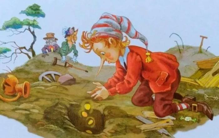 Кот и Лиса убеждали милую деревянную куклу закопать свои золотые монеты в