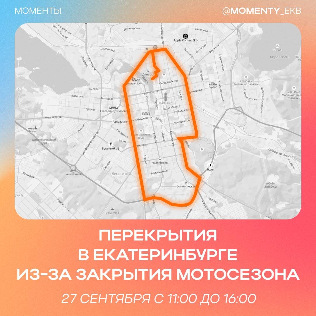 В Екатеринбурге пройдет мотопарад. Его посвятят закрытию мотосезона — сотни байкеров стартуют от ККТ «Космос» и проедут по улицам города. Кажется, автомобилистам 27 сентября лучше отказаться от поездок… Собрали перекрытия дорог в карте. Выбирайте альтернативные пути, чтобы избежать пробок. Подписаться 🔸 Обсудить