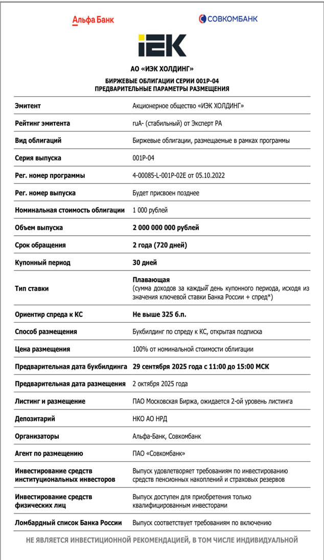 Новый выпуск облигаций от эмитента с хорошей историей и «стабильным» рейтингом? На фоне снижения ключевой ставки интерес к корпоративным облигациям остается высоким, и инвесторы внимательно присматриваются к новым предложениям. Ситуация на рынке складывается так, что даже умеренно надежные эмитенты могут предложить доходность на уровне выше 18-20% годовых, что выглядит привлекательно в сравнении с депозитами и ОФЗ. В этом контексте новый выпуск ИЭК Холдинг выделяется как инструмент с предсказуемой структурой: двухлетний срок обращения, ежемесячные купоны и привязка к ключевой ставке. Разберем надвигающийся выпуск в деталях: 👉Параметры выпуска: ▪️Объем — 2 млрд рублей. ▪️Срок обращения — 2 года. ▪️Купон — ключевая ставка ЦБ + спред (ориентир по спреду до 325 б.п.). ▪️Купонный период — 30 дней. ▪️Рейтинг эмитента — ruA- «Стабильный» (Эксперт РА). ▪️Дата сбора книги — 29 сентября 2025 г. ▪️Размещение — 2 октября 2025 г. ▪️Выплата купонов — ежемесячно. ▪️Статус квала — присутствует. Е