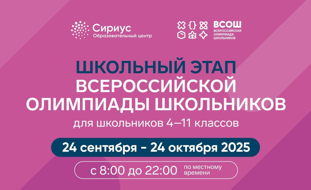 С 24 сентября по 23 октября для школьников Тверской области на платформе «Сириус.Курсы» пройдет школьный этап всероссийской олимпиады школьников (ВсОШ) 2025-2026 учебного года. Участники получат возможность попробовать себя в решении нестандартных заданий, применить свои знания, логическое мышление и творческий подход. Школьный этап проводится по шести естественно-научным предметам: математике, информатике, физике, химии, биологии и астрономии. Дополнительная информация о проведении школьного этапа ВсОШ на платформе «Сириус.Курсы» для участников Тверской области размещена на сайте регионального координатора. Подписаться на Пул69 в МАХ